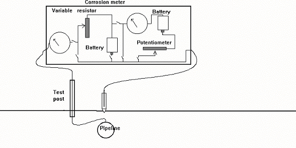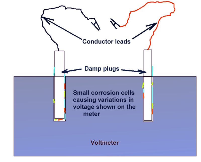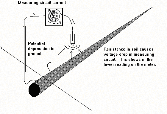 This 'volts drop' in the measuring circuit caused substantial inaccuracies in the measurement, and the readings were shown to be lower than the true voltage. This is the opposite effect to that of the 'IR drop in the soil' which is caused by the passage of the cathodic protection current.