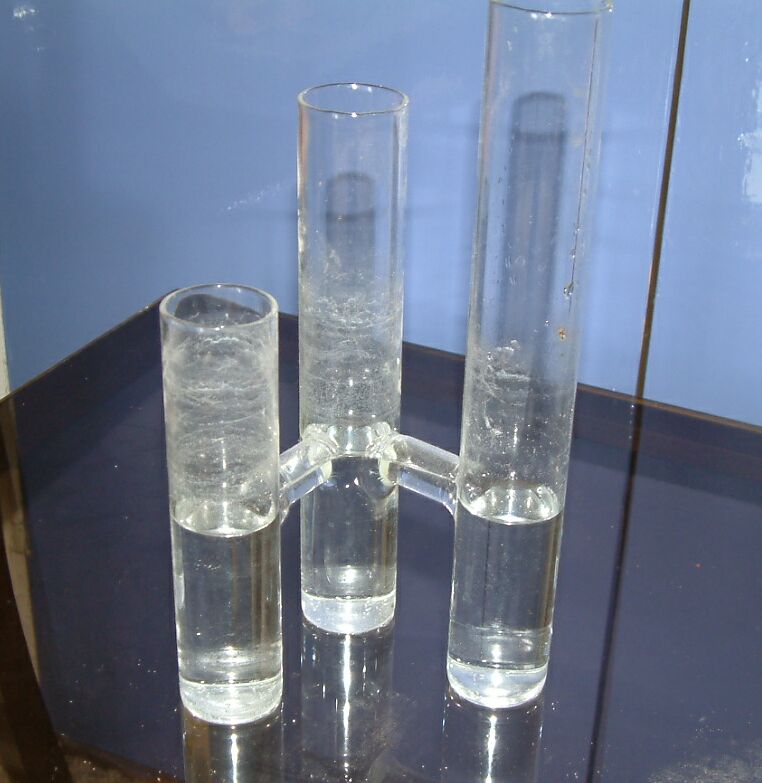 This third container can be seen to be filled to a level above that of the connecting tubes.
