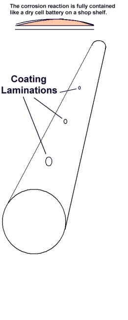 This can be likened to a situation on a pipeline, as drawn, where there are three places where the coating has disbonded from the pipe metal but there is no hole in the caoting material.