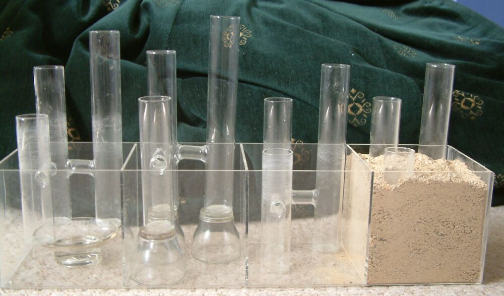 Each vase is composed of three upright tubes connected by small tubes through which the water can pass.
