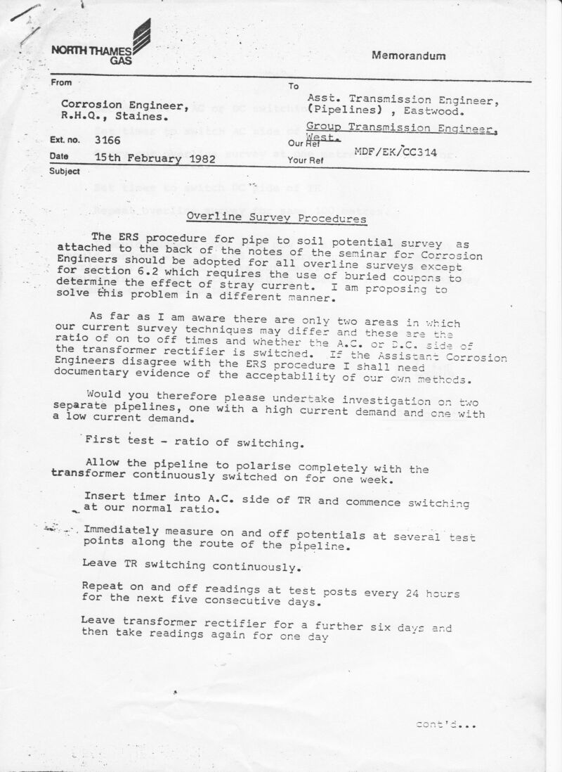 The Gas Council Engineering Reseach Station (ERS) in the north east of the UK examined and ratified the science of cathodic protection and advised regional corrosion engineers on matters of field implementation.