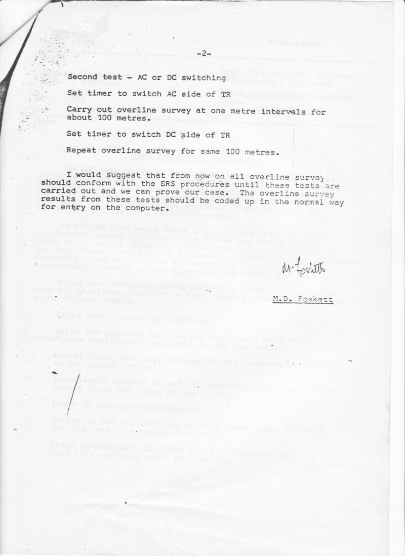 In 1973 cathodic protection technicians were issued with analogue galvanometers with a measuring circuit resistance of 10,000ohms per volt and their duties were to record voltage measurements between the steel of the pipeline and a copper/copper-sulphate electrode placed on the ground near to the 'test lead' which the contractors had 'cad-welded' to the pipeline.