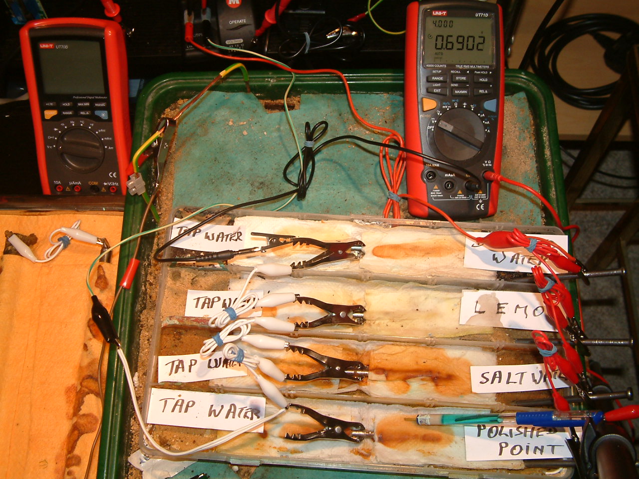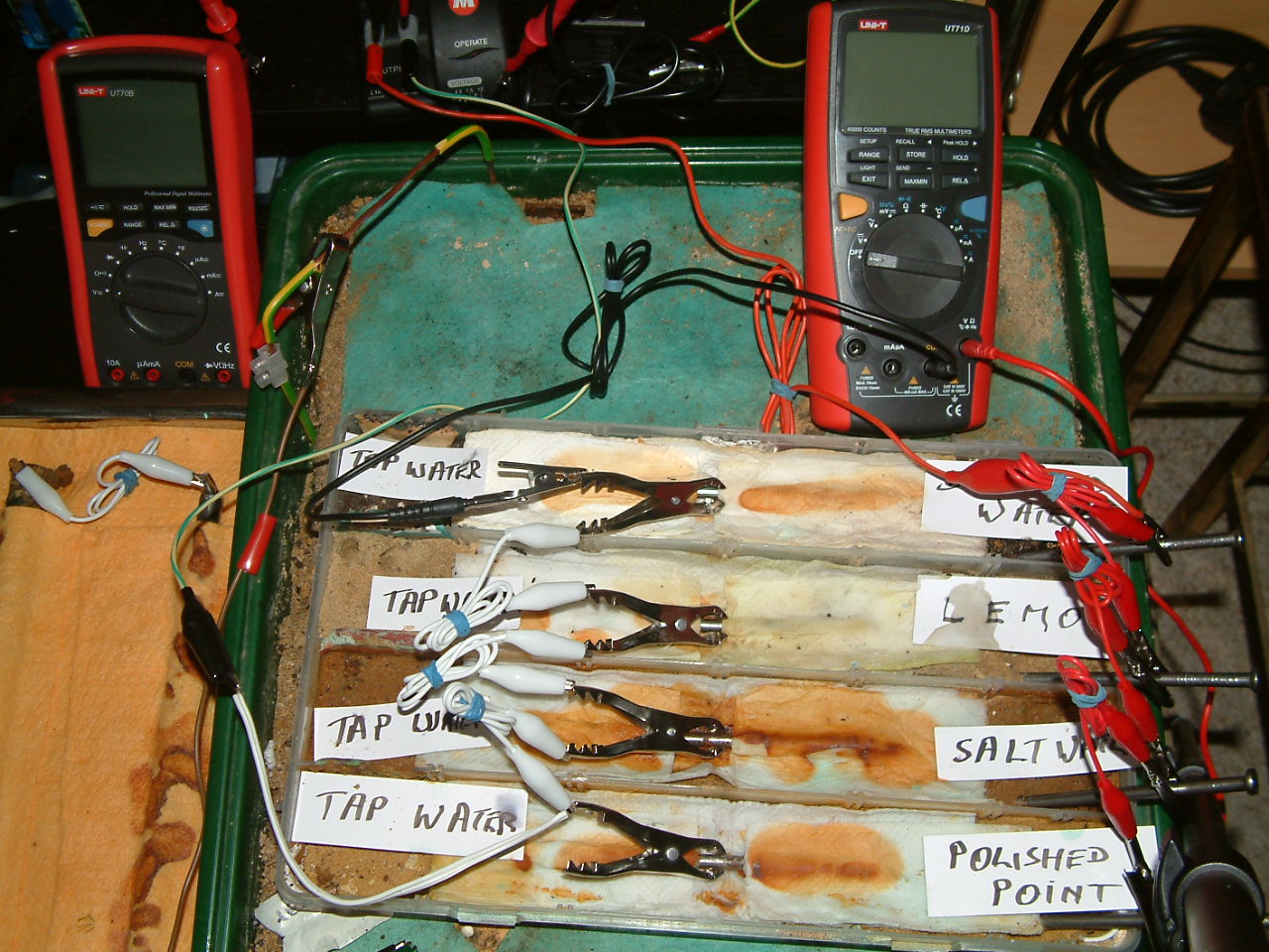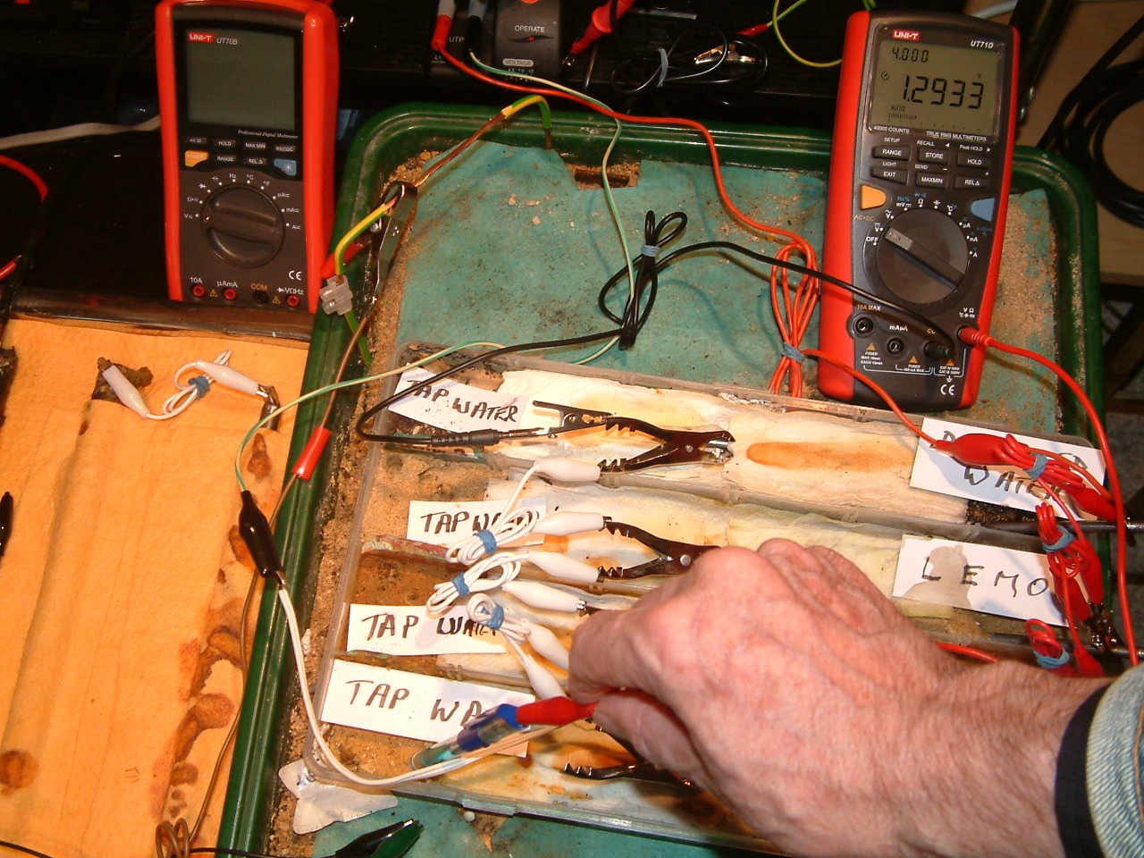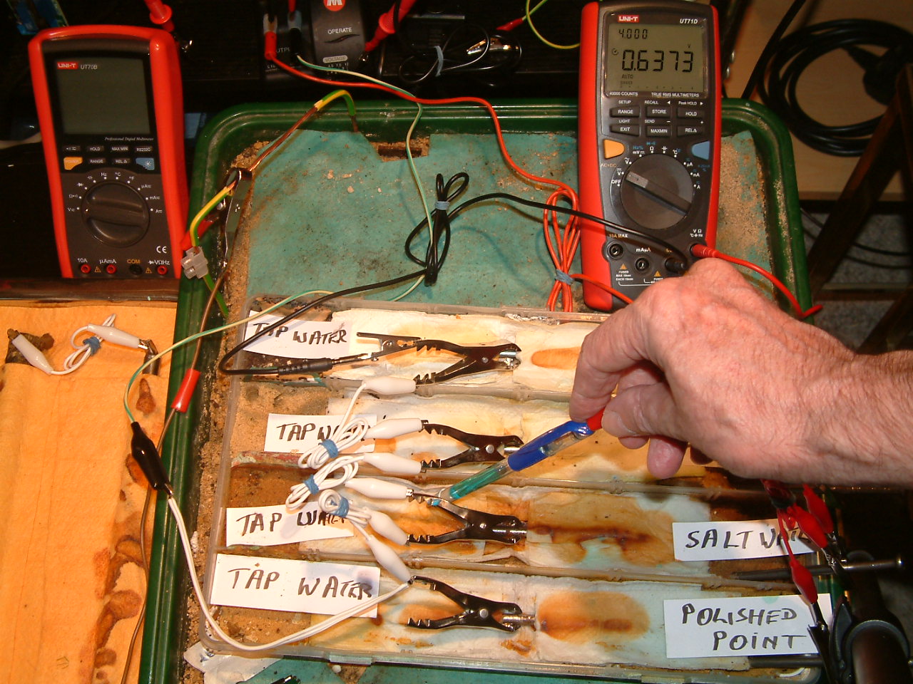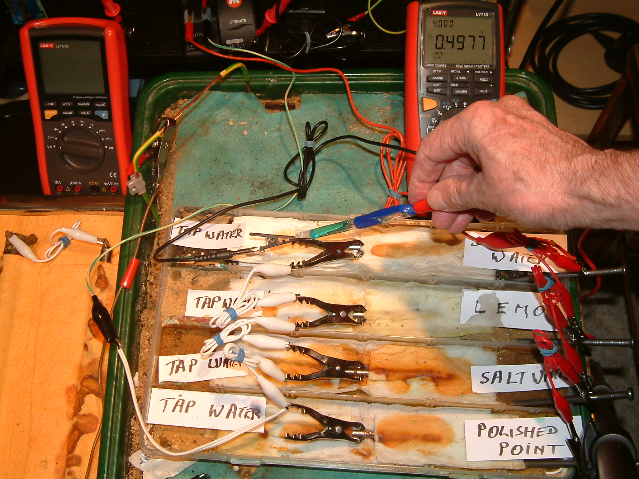 In this series we use a copper/copper-sulphate electrode made of a plastic tube (the shell of a ball point pen) filled with copper-sulphate solution and a copper wire to connect to the probe of the meter.