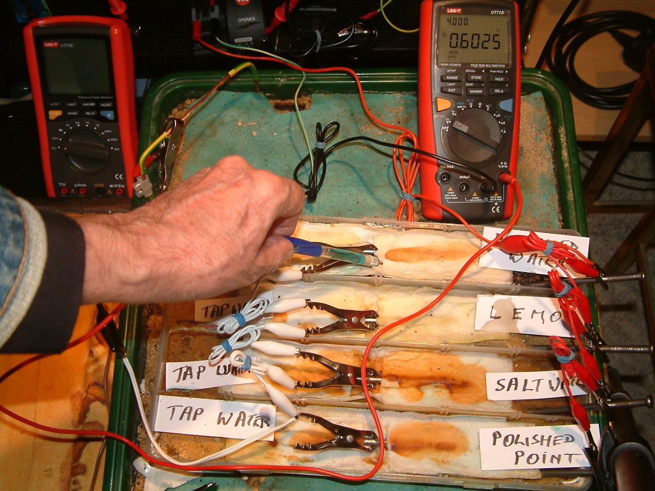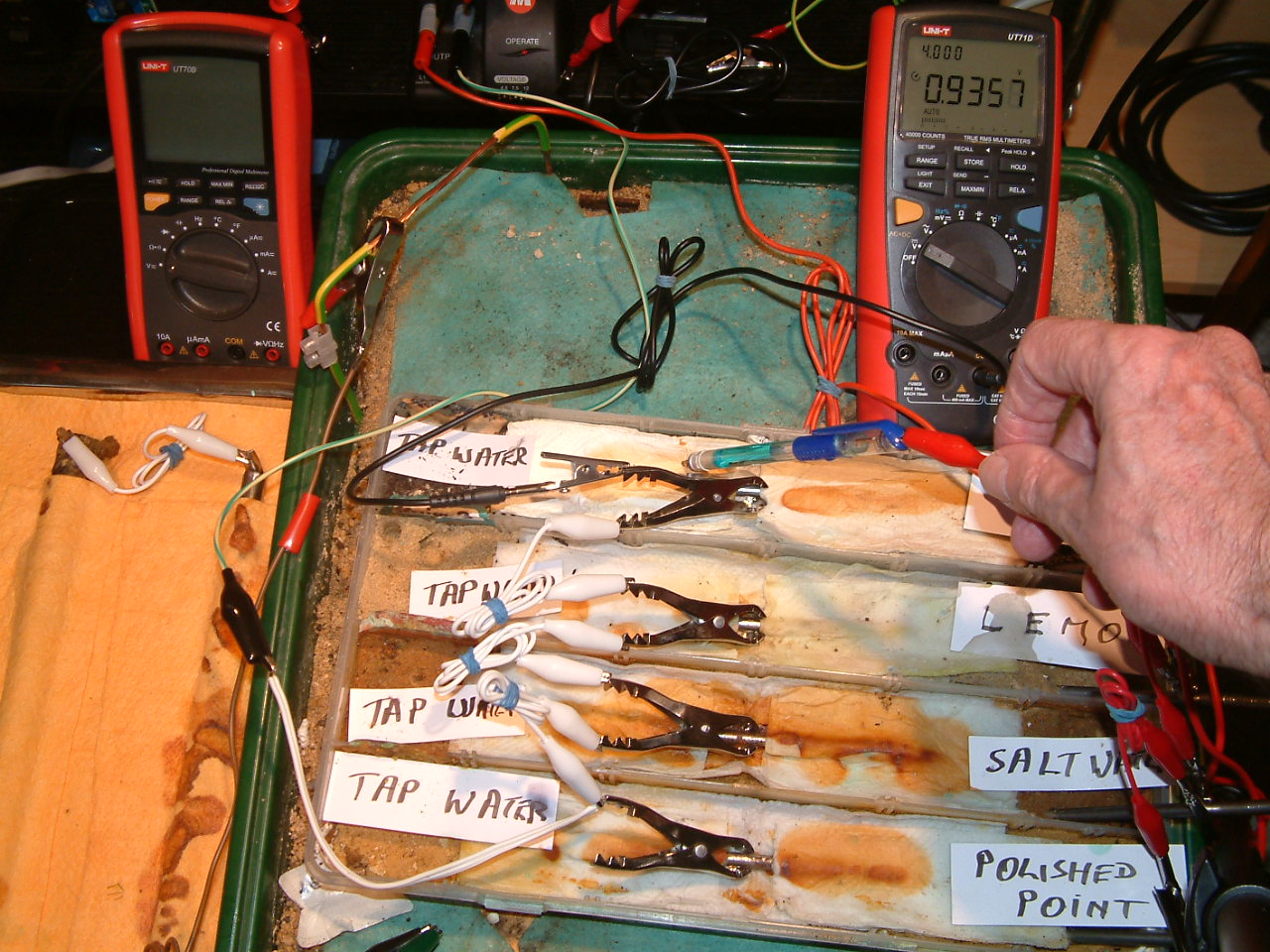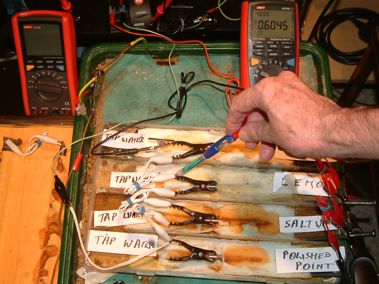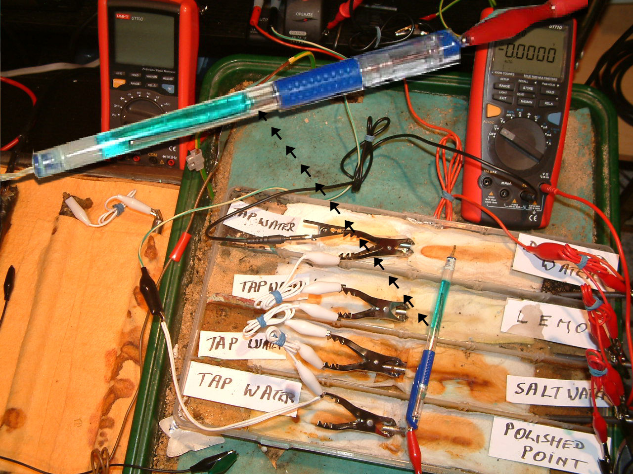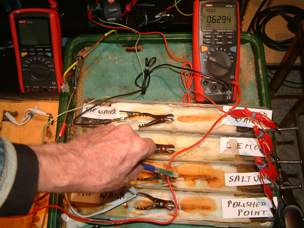 In this series we use a copper/copper-sulphate electrode made of a plastic tube (the shell of a ball point pen) filled with copper-sulphate solution and a copper wire to connect to the probe of the meter.