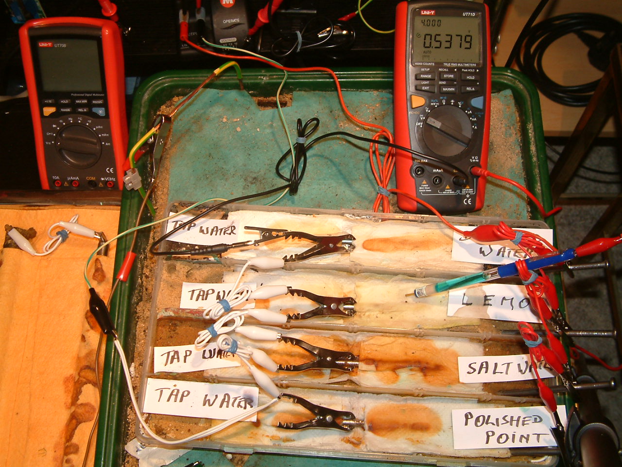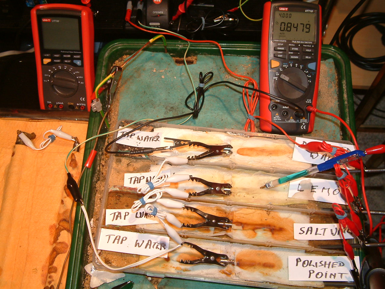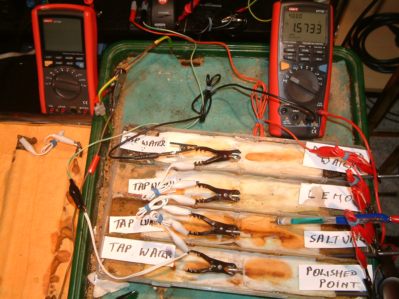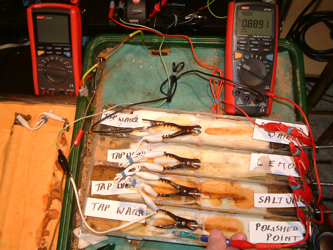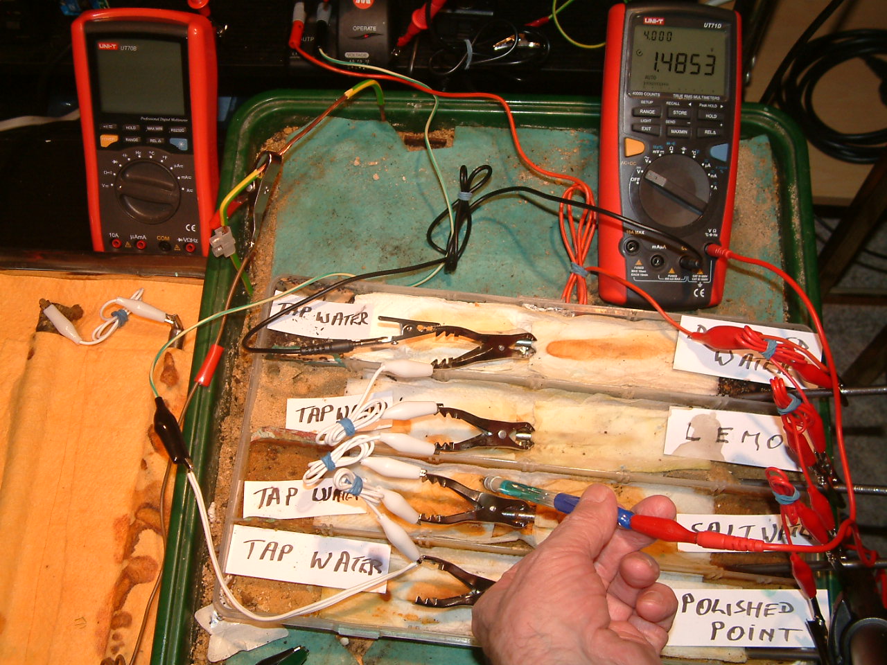 In this series we use a copper/copper-sulphate electrode made of a plastic tube (the shell of a ball point pen) filled with copper-sulphate solution and a copper wire to connect to the probe of the meter.
