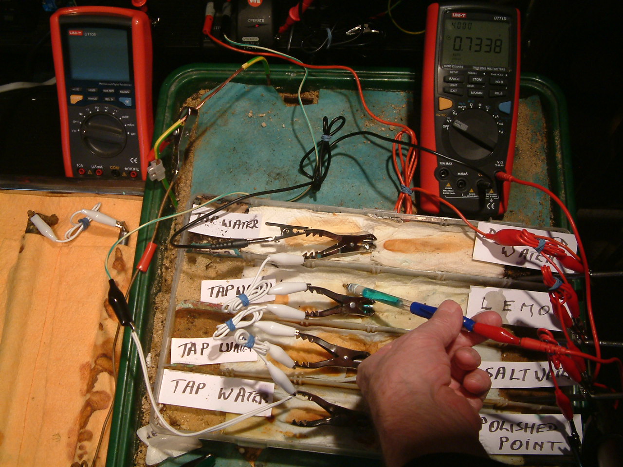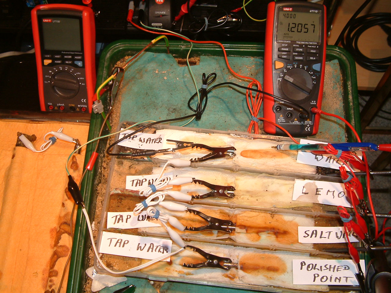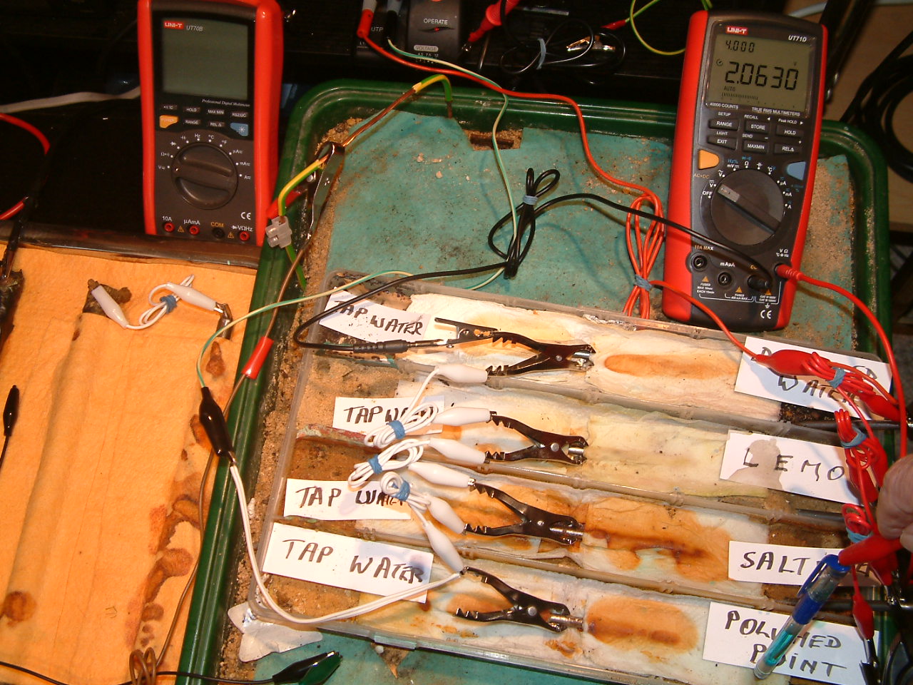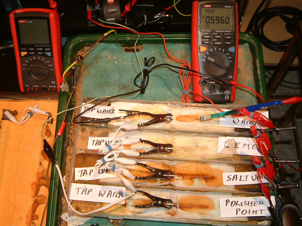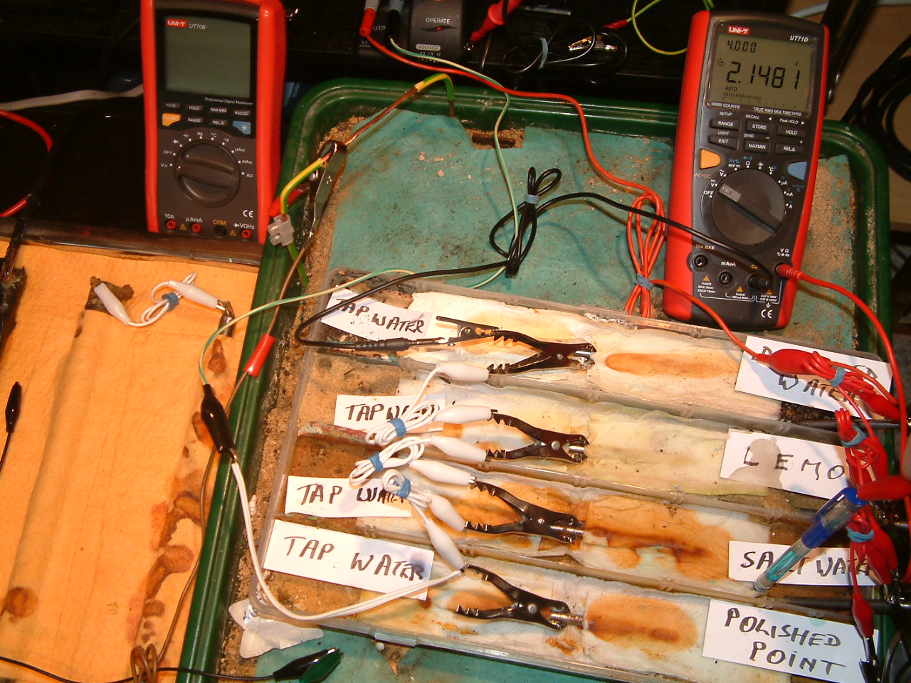 In this series we use a copper/copper-sulphate electrode made of a plastic tube (the shell of a ball point pen) filled with copper-sulphate solution and a copper wire to connect to the probe of the meter.
