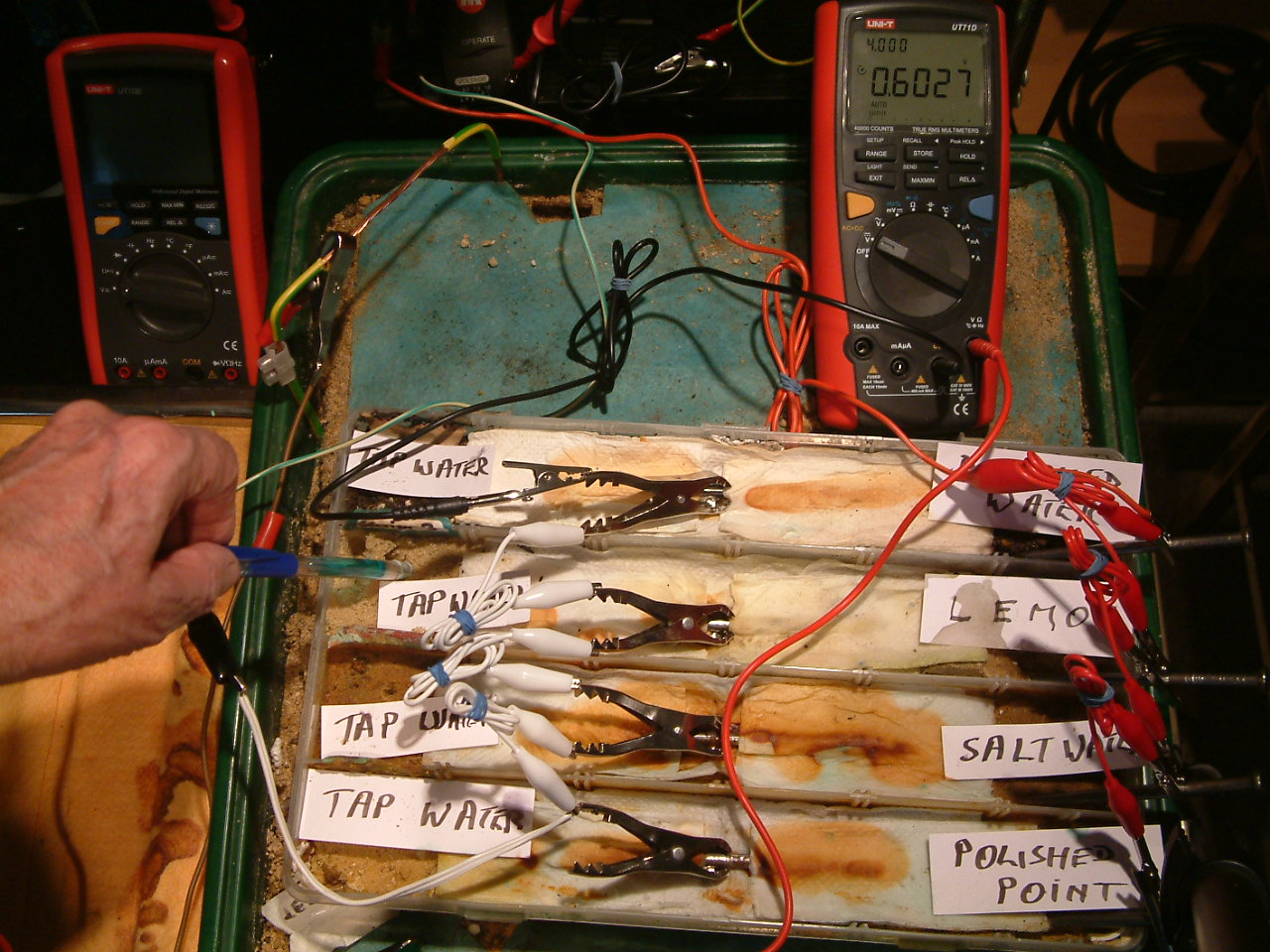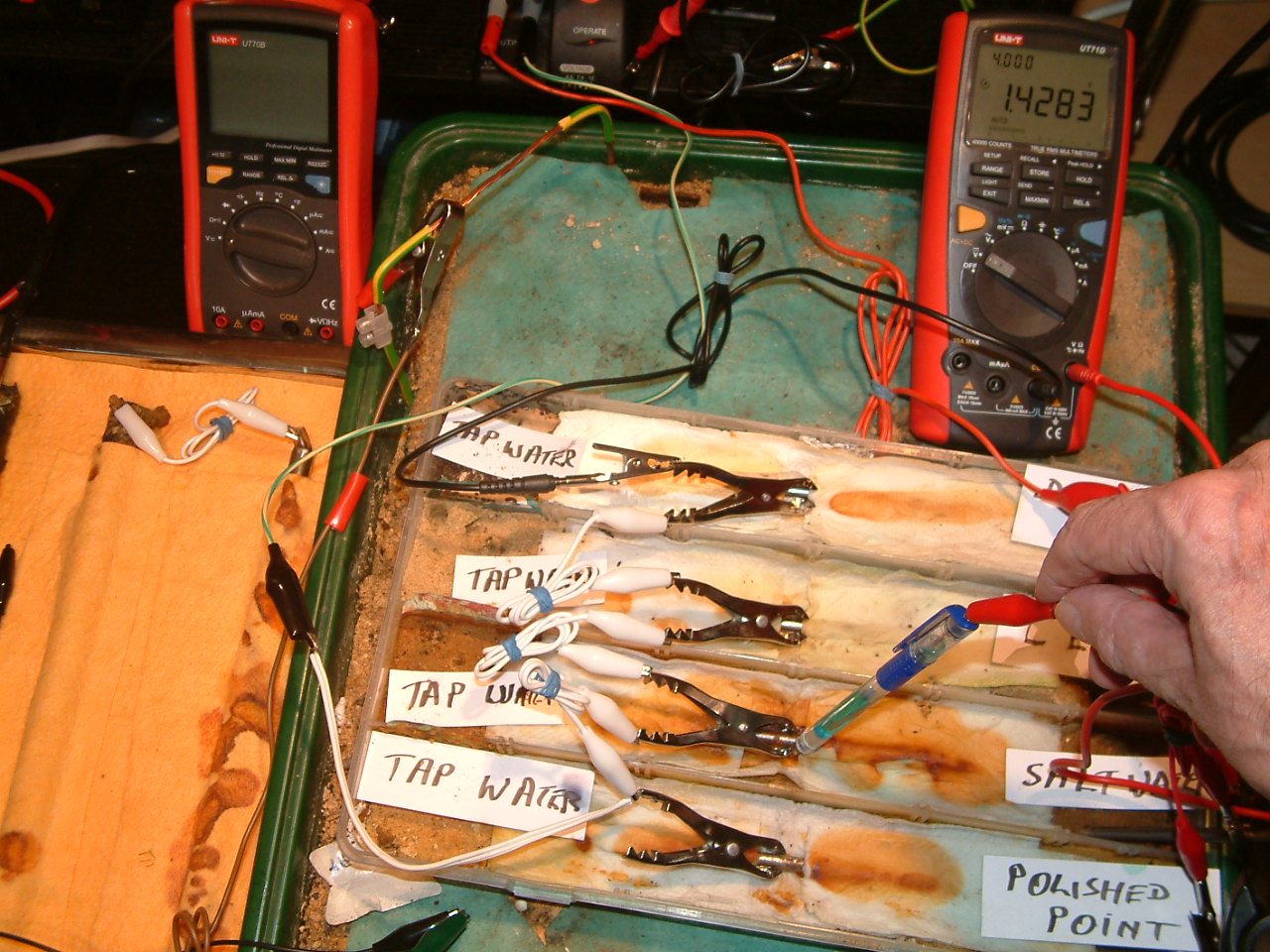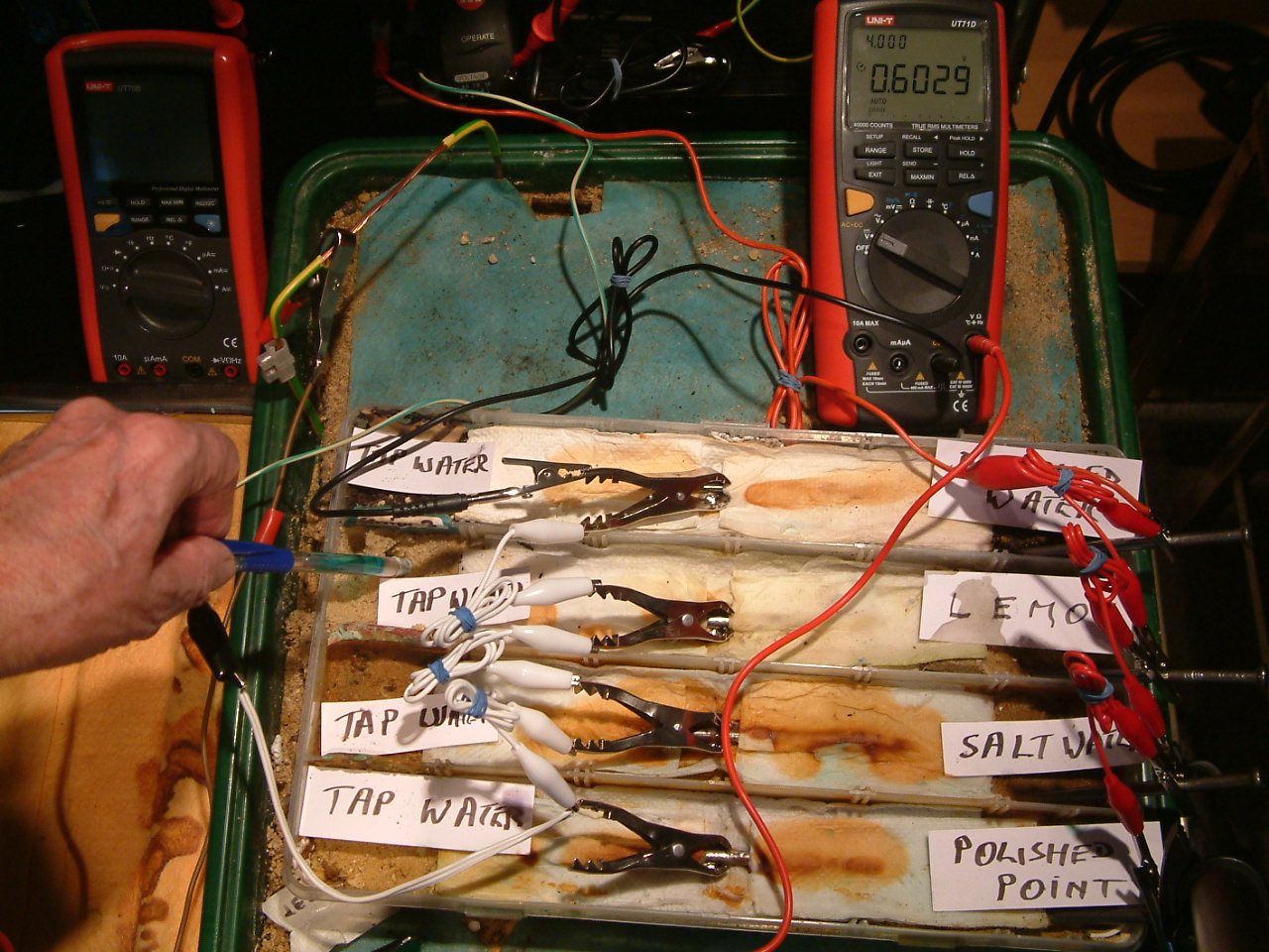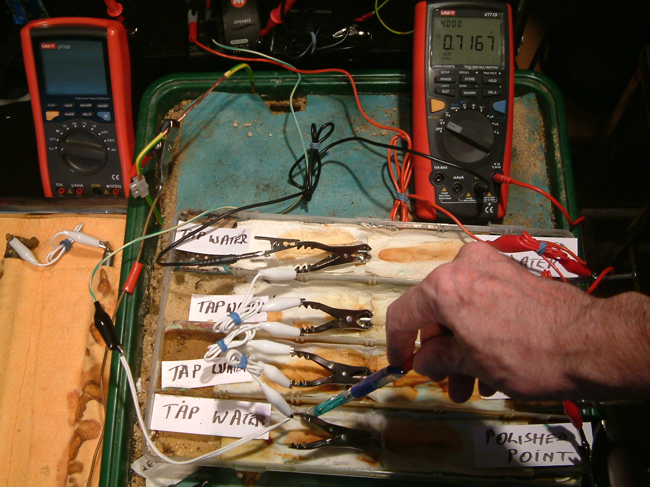 The copper/copper-sulphate capillary probe is placed under the nail crocodile clip in the second partition, in contact with the electrolyte at this point. The electrolyte potential at this location is seen to be 0.6373 v more than the subject nails that the meter sees as zero.