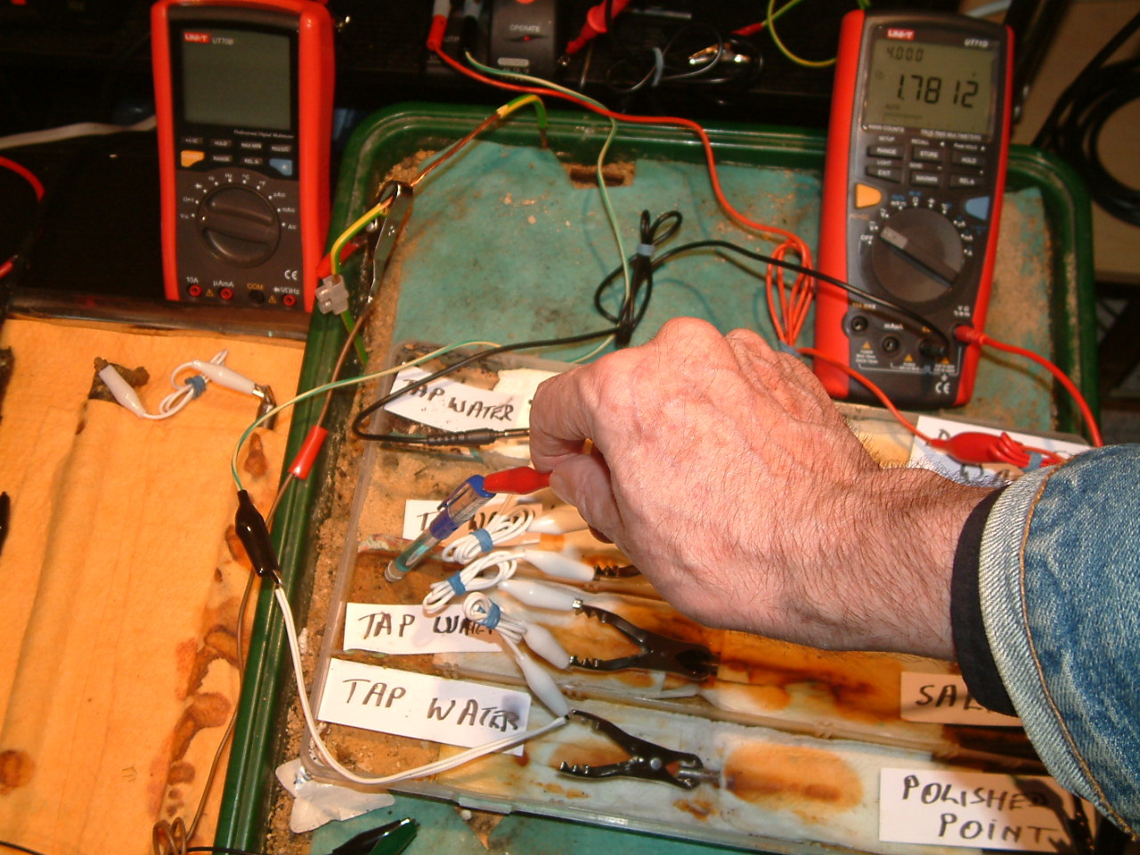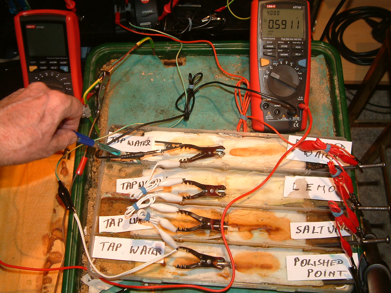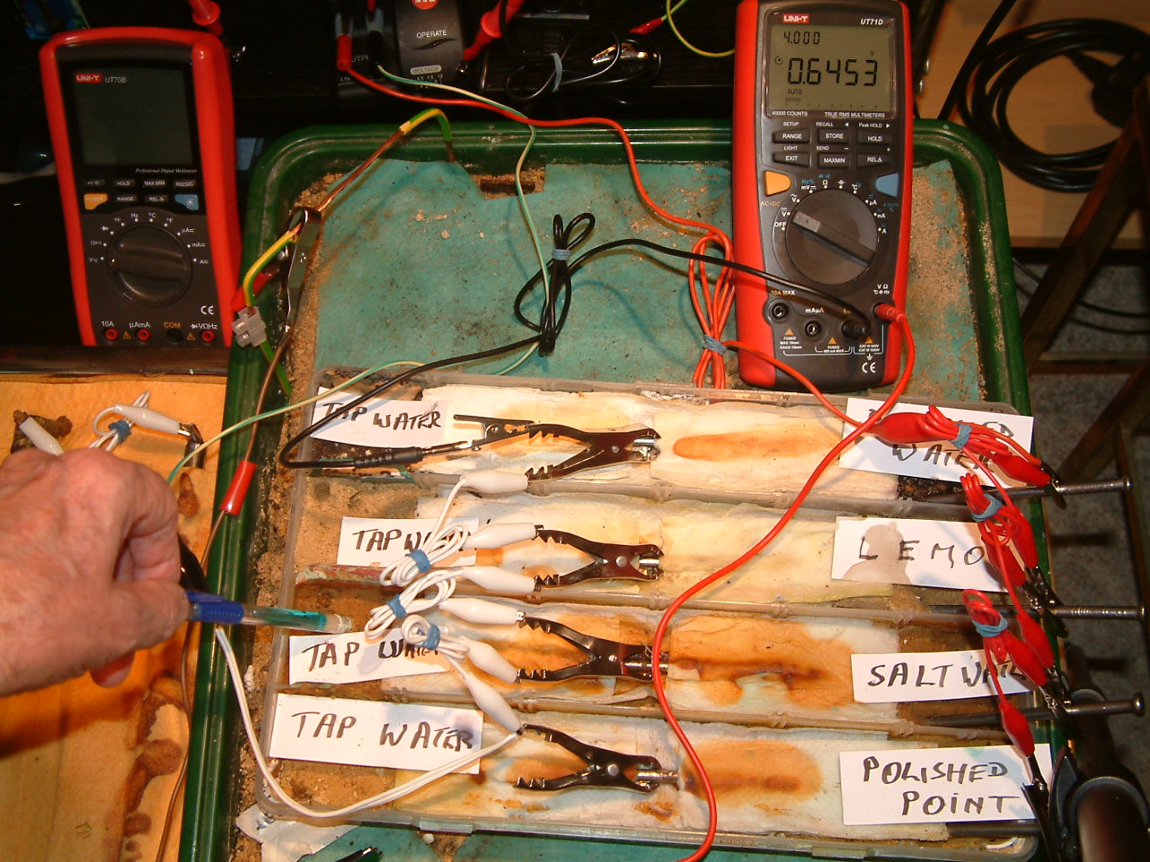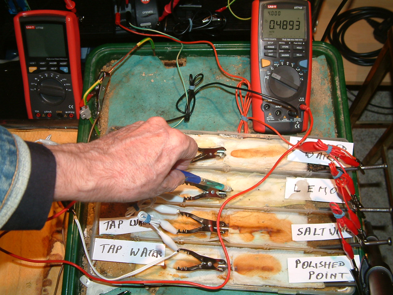 The power supply is energised and the potential difference between the copper/copper-sulphate electrode in partition one and the subject nails is now 2.0630v.