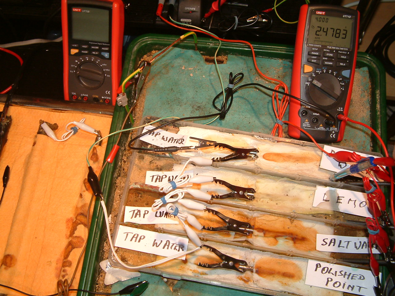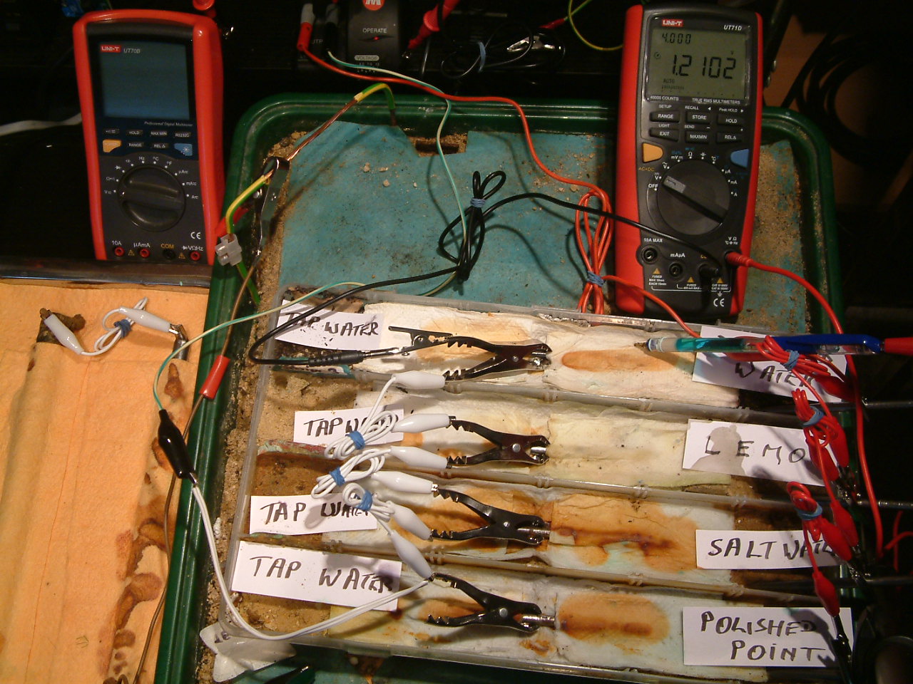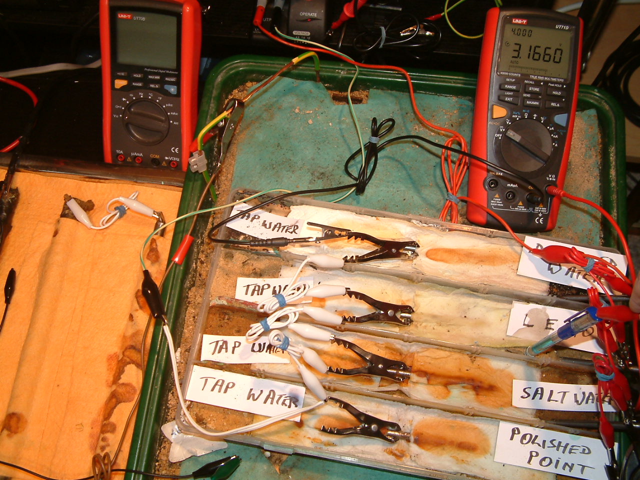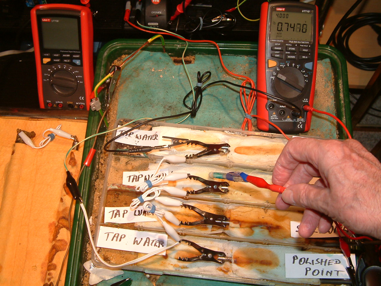 The power supply is energised and the potential difference between the copper/copper-sulphate electrode in partition one and the subject nails is now 2.0630v.
