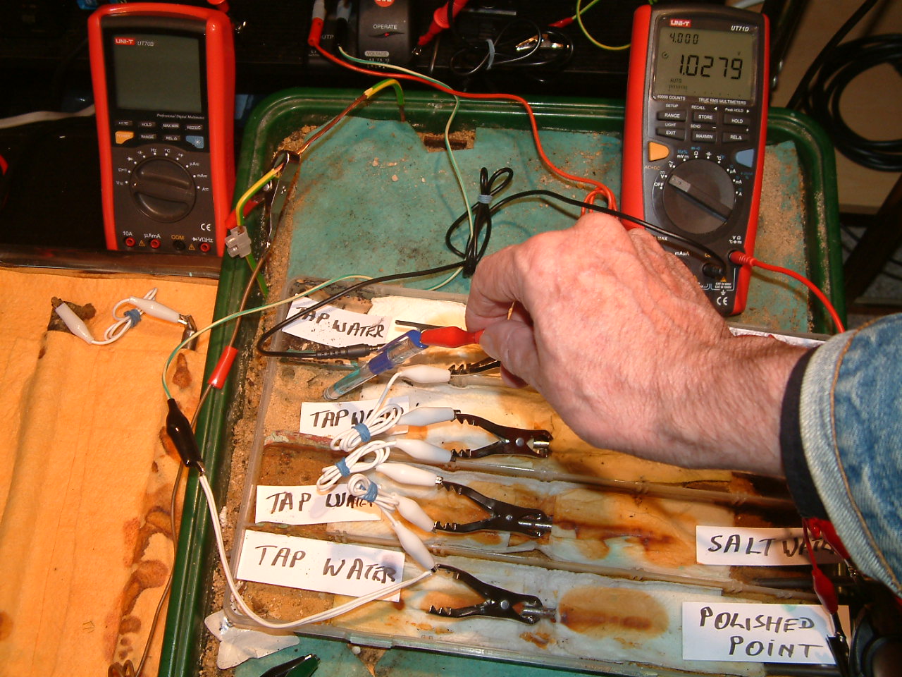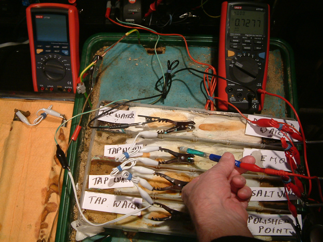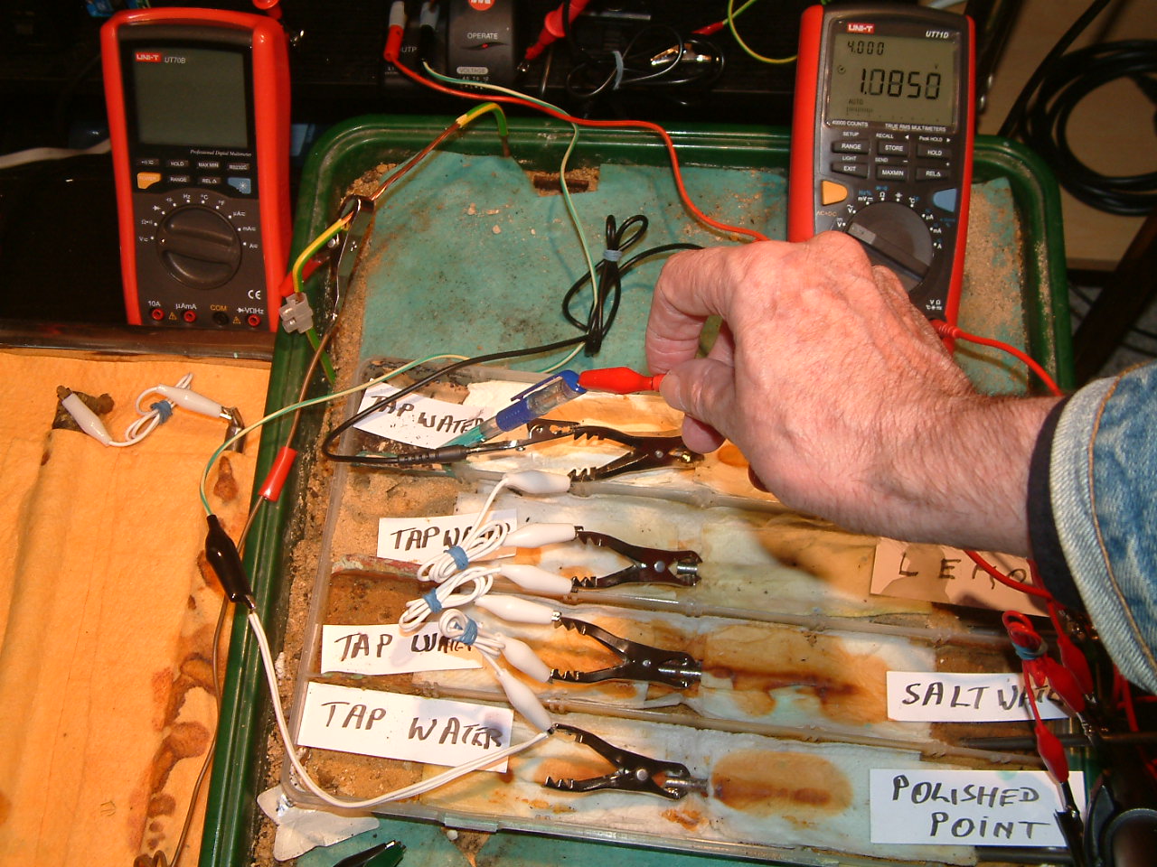 The power supply is energised and the potential difference between the copper/copper-sulphate electrode in partition one and the subject nails is now 1.0277v.