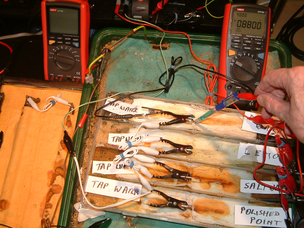 The power supply is energised and the potential difference between the copper/copper-sulphate electrode in partition three and the subject nails is now 0.8479 v.
