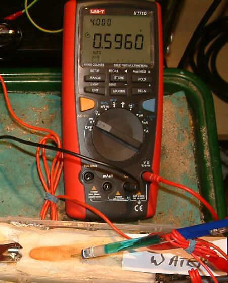 The ground contact electrode is placed in the forth partition and the meter displays 0.5960 volts.