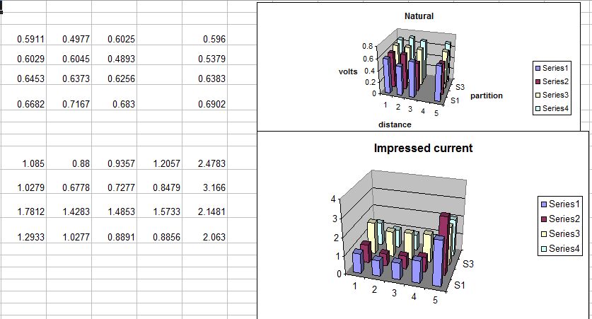 The copper/copper-sulphate electrode probe remains in the same position in the second partition. The electrolyte potential at this location is has changed to 0.6294 v more than the subject nails that the meter sees as zero. These are potential changes over time in the potential of the electrolyte at the point of contact.
