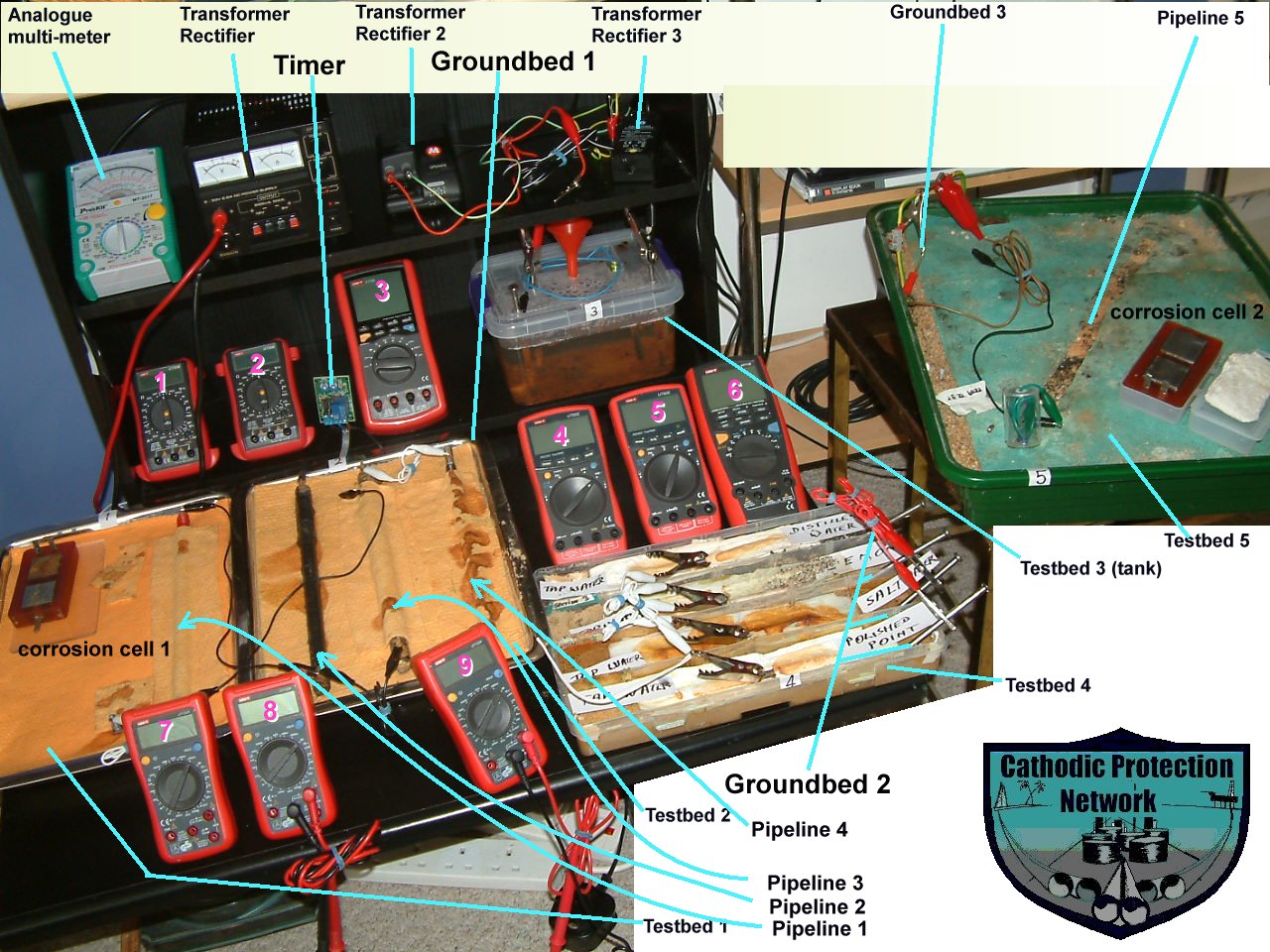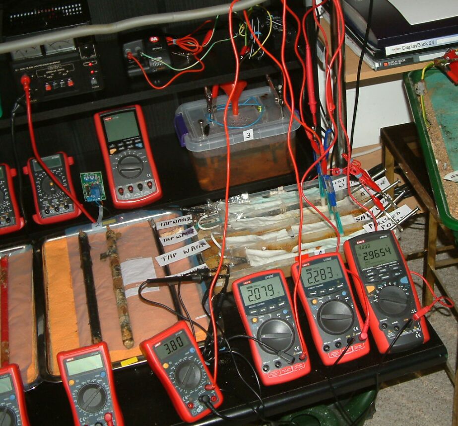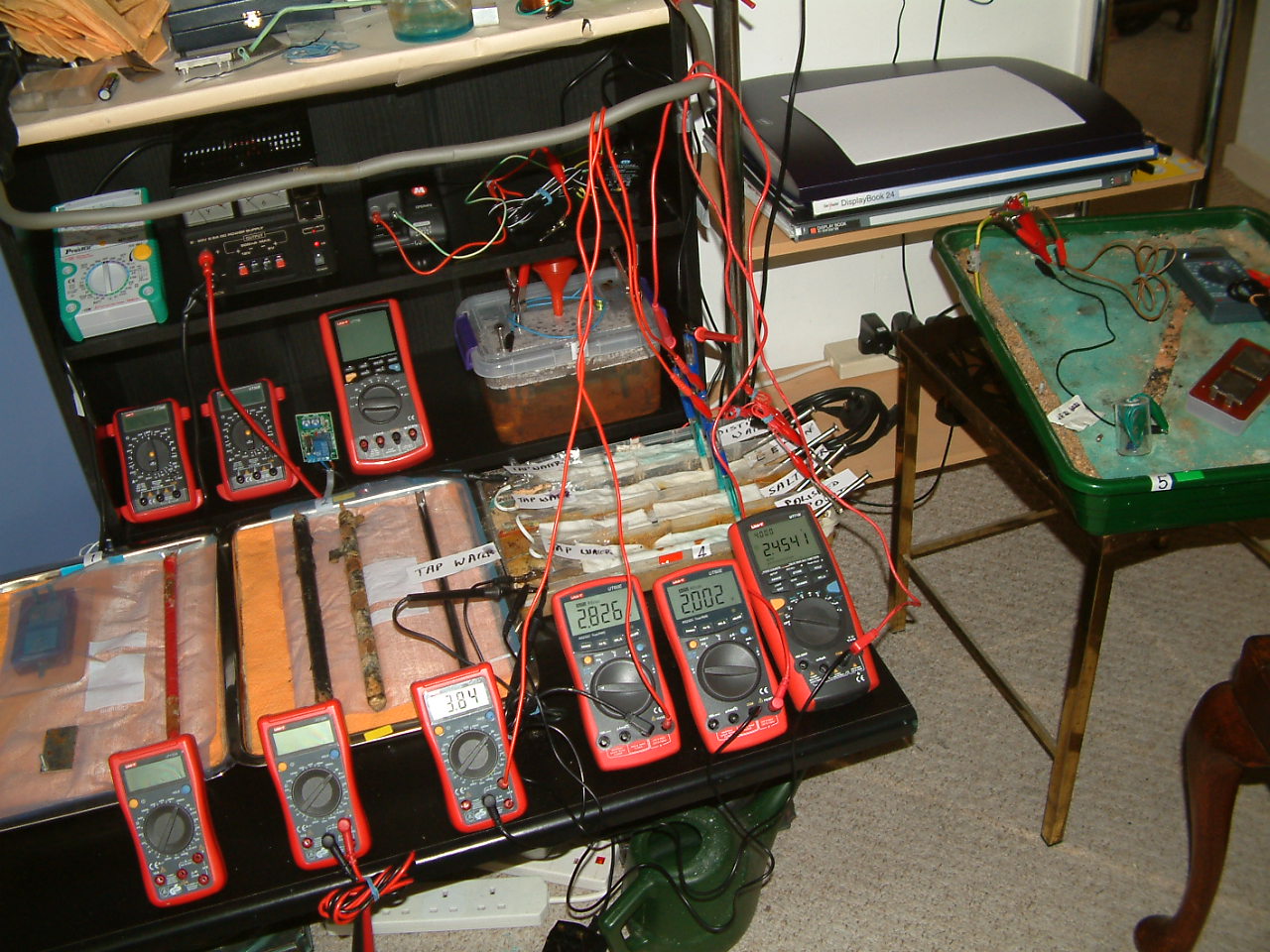 The front four multimeters are connected to measure the pipe-to-soil voltages and their test leads are arranged so that all the probe positions and displayed voltages can be seen at each stage of the test.
