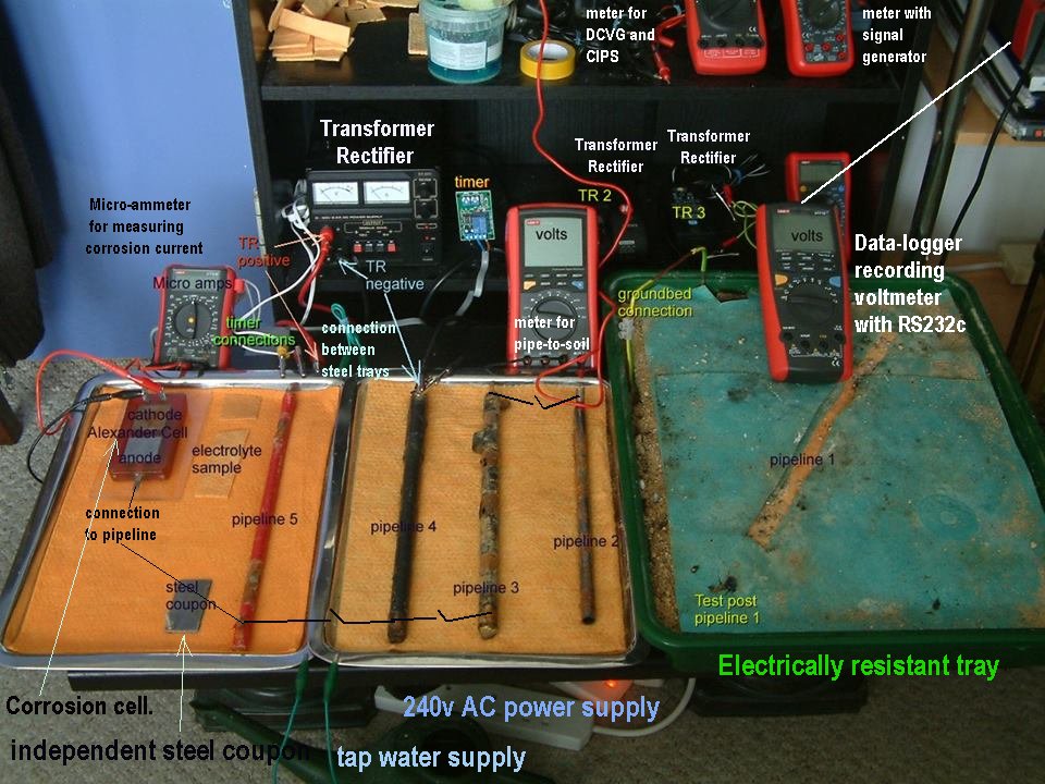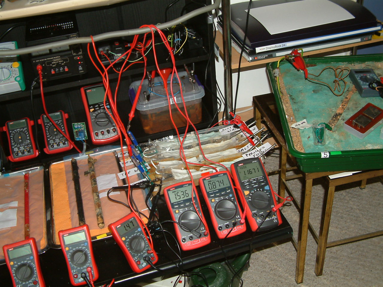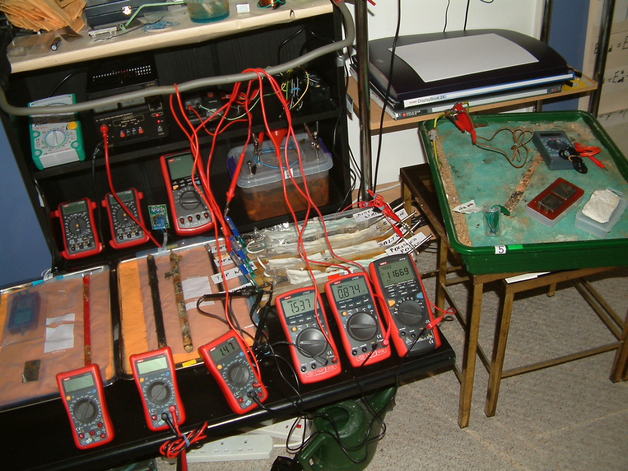 The front four multimeters are connected to measure the pipe-to-soil voltages and their test leads are arranged so that all the probe positions and displayed voltages can be seen at each stage of the test.