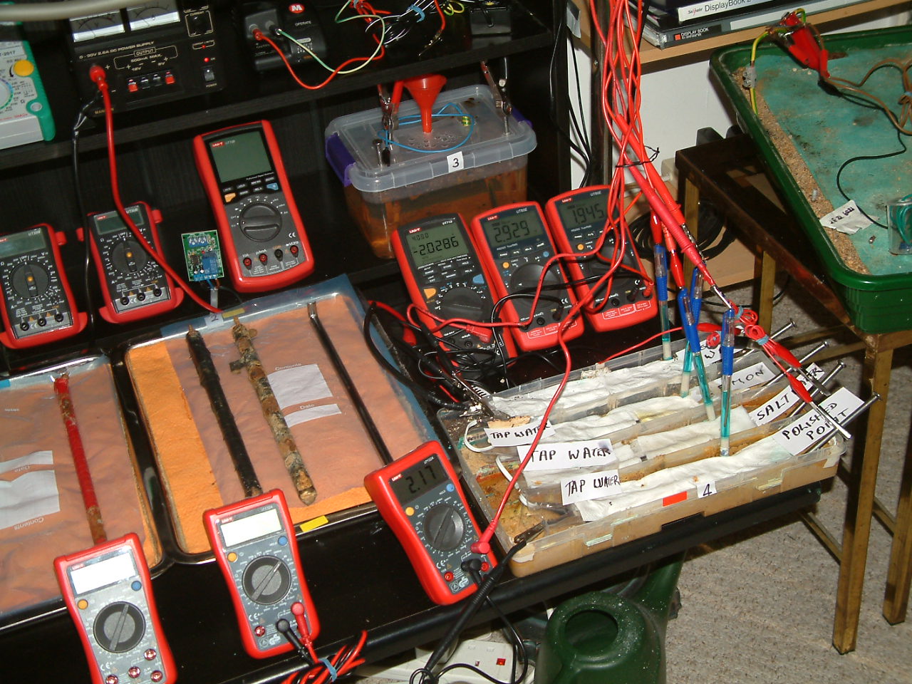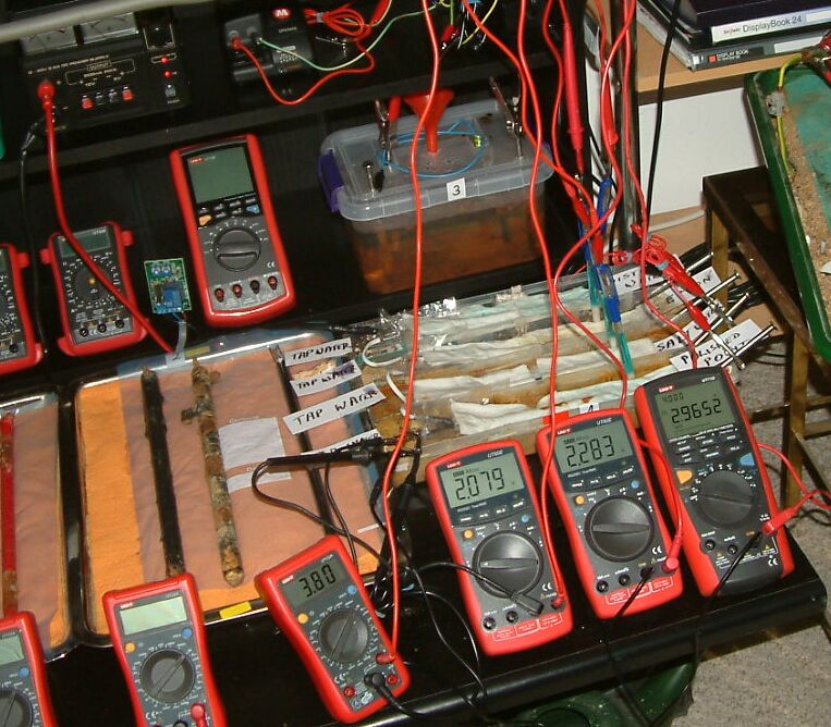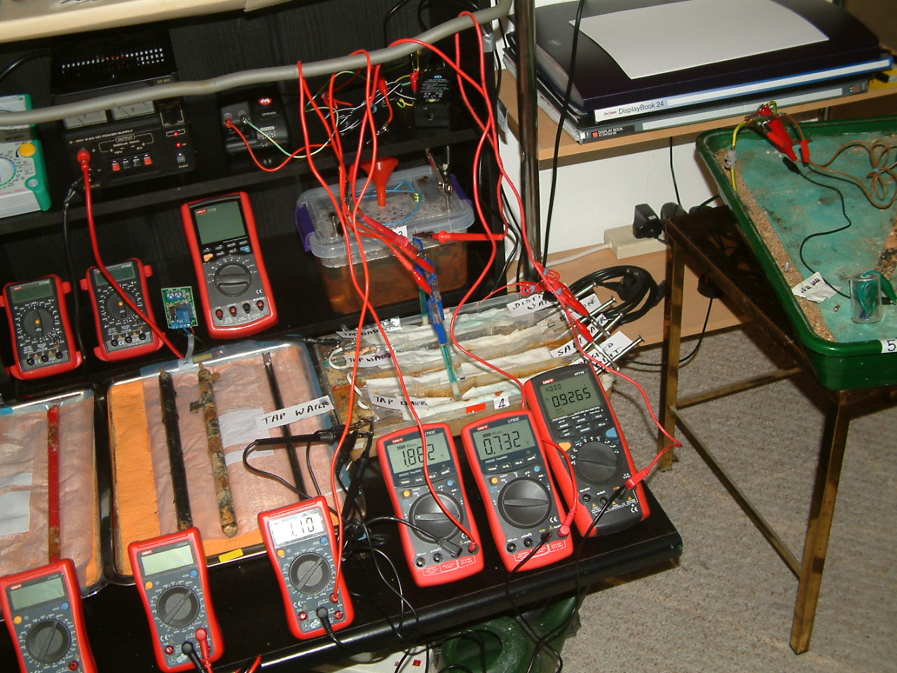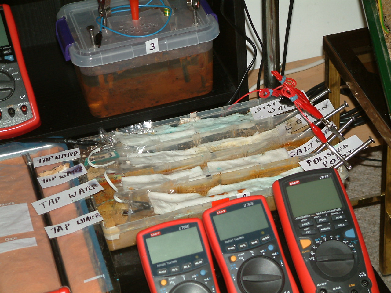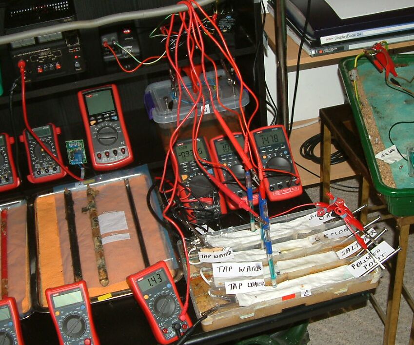 The meter on the far left is connected between the half-cell on the right of the picture that is positioned in the front partition of the test tray and displays 2.17 volts.
