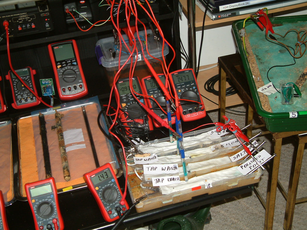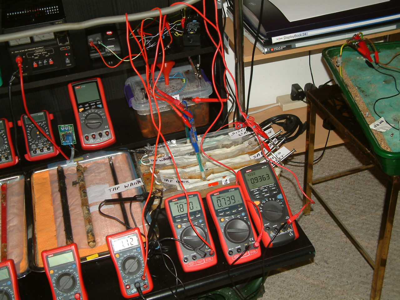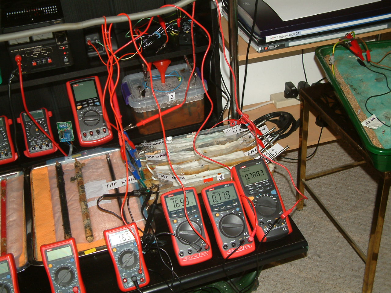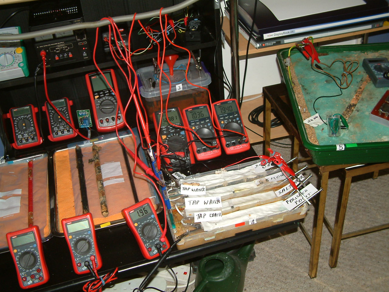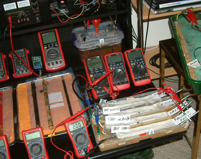 The meter on the far left is connected between the half-cell on the right of the picture that is positioned in the front partition of the test tray and displays 2.17 volts.