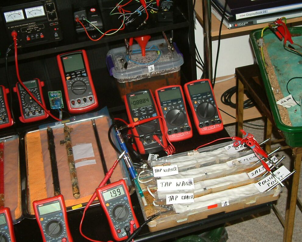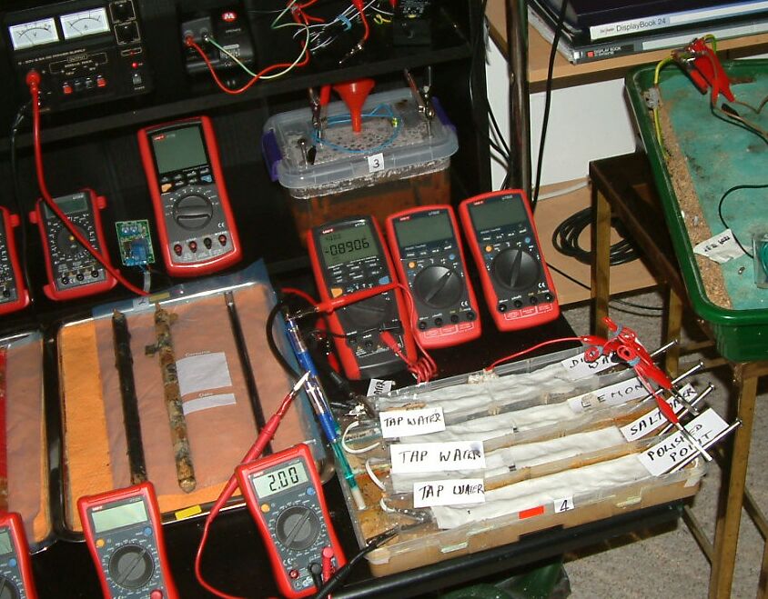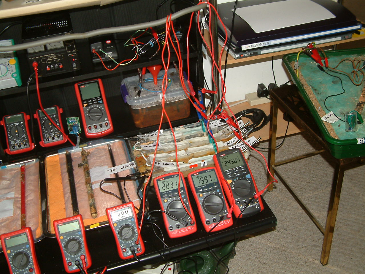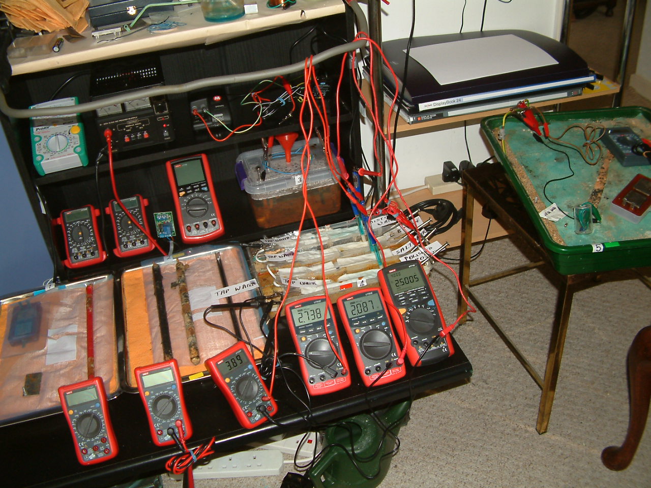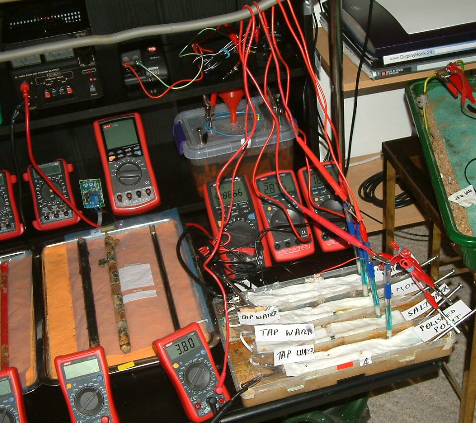 The meter on the far left is connected between the half-cell on the right of the picture that is positioned in the front partition of the test tray and displays 2.17 volts.