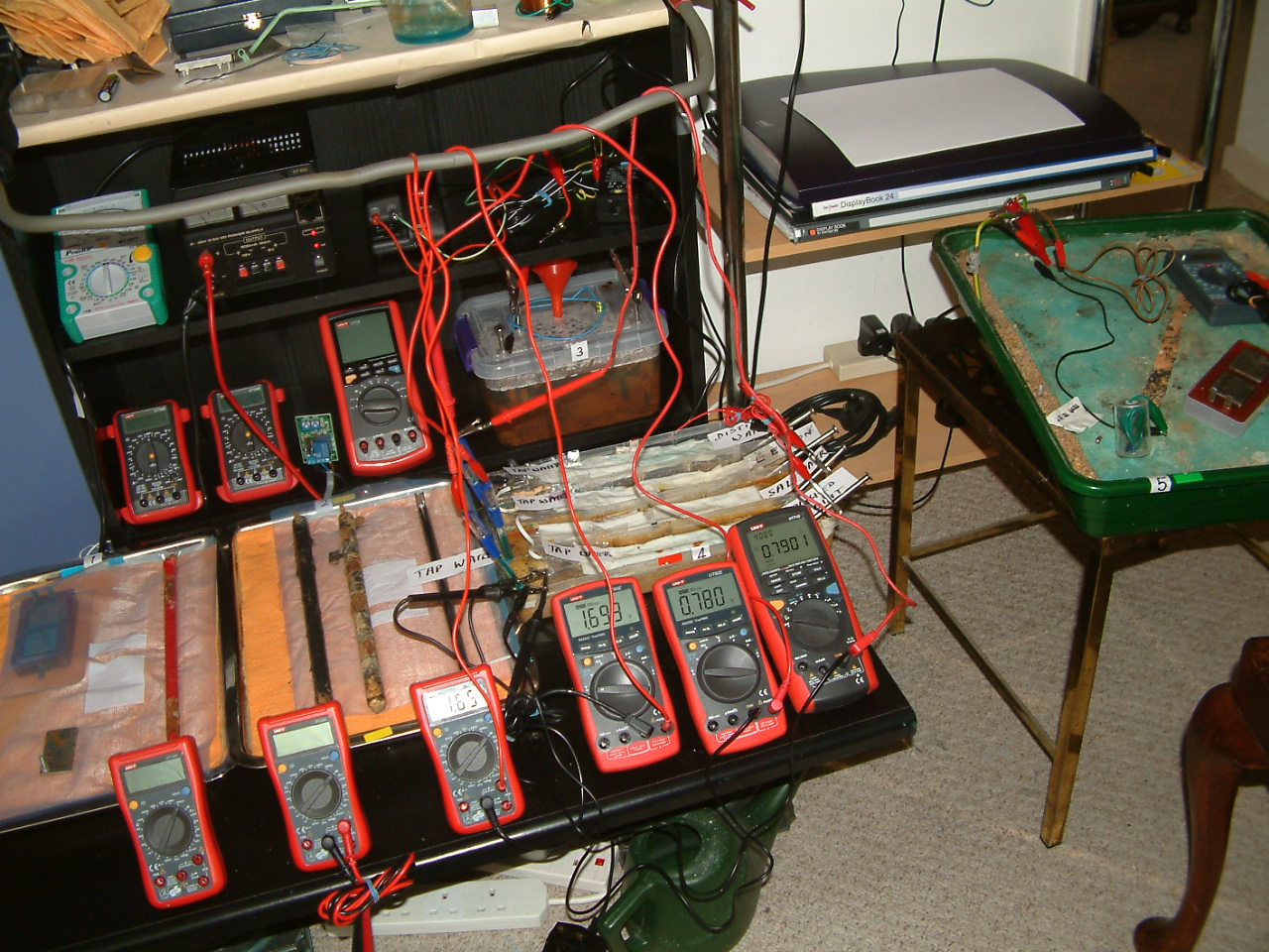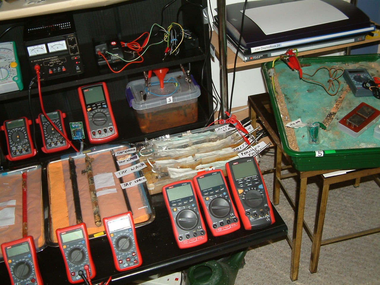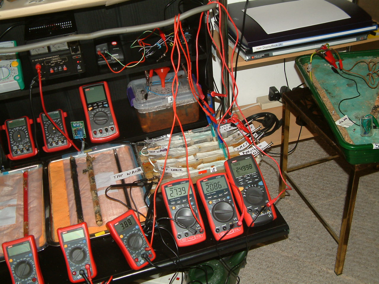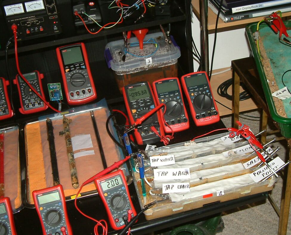 The meter on the far left is connected between the half-cell on the right of the picture that is positioned in the front partition of the test tray and displays 2.17 volts.