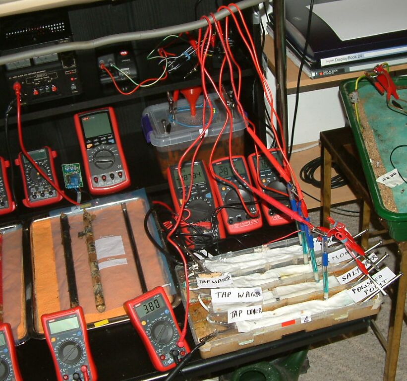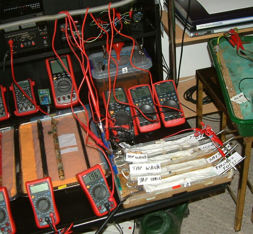 The right hand meter is connected to the half-cell in the fourth partition and shows 1.8nn volts.