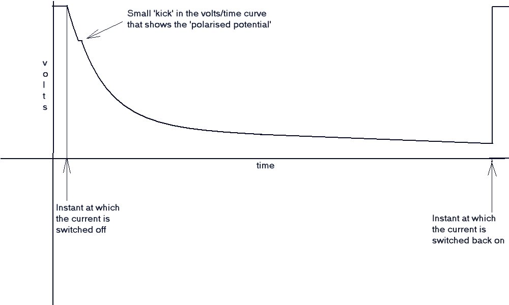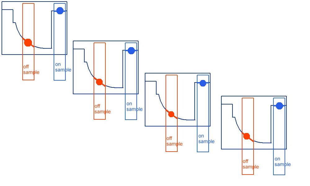 The instrument makes voltage measurements at the rate of 40,000 per second and the software takes samples of a set number of voltages in the 'on' mode and in the 'off' mode. The software then averages each sample and allocates them to an 'on point' on the graph and an 'off point' on the graph, as shown in the drawing above.